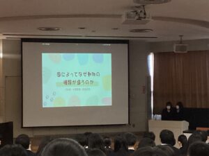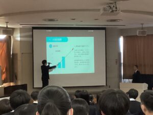 1月16日(金)5・6限、2年生は「総合的な探究の時間」の発表会を行いました。各クラスの代表生徒が、それぞれの研究テーマについて、スライドを用いて発表しました。